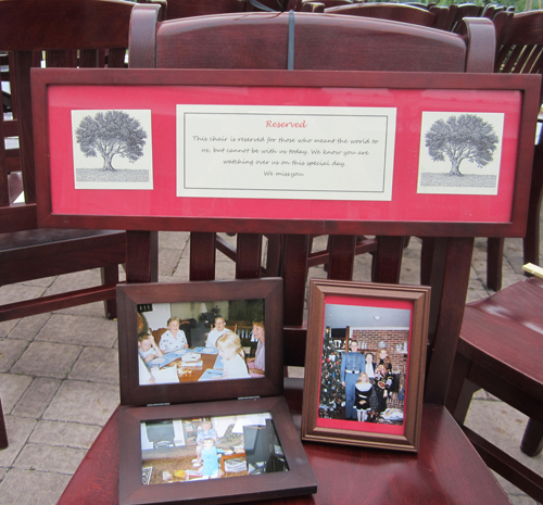 Signs are big at weddings.  Especially at outdoor weddings, signs direct people to the actual wedding site (see insert to right) or the reception.  Other signs reserve seating for the immediate families of the bride and groom.  One of the most memorable signs I have seen of late reserved a chair for deceased family members of the bride and groom—an empty chair indicating that despite their absence, their deceased loved ones were not forgotten on that most special of days (see insert on left). Some wedding signs are professionally printed, but others are handmade.